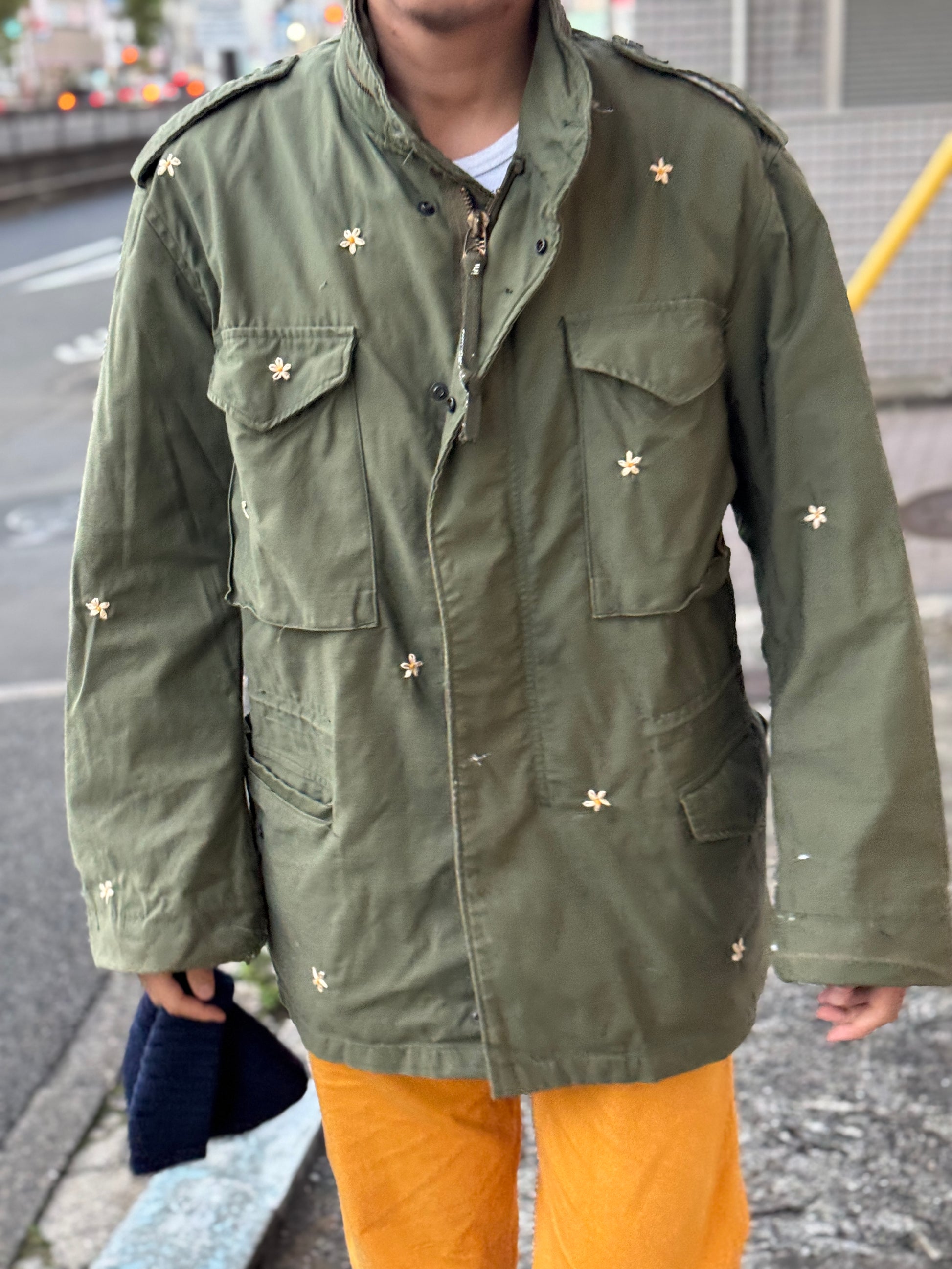 ALPHA INDUSTRIES INC.製 アメリカ軍実物のフィールドジャケットにシャナナミルのデイジー手刺繍を加えた1着。
