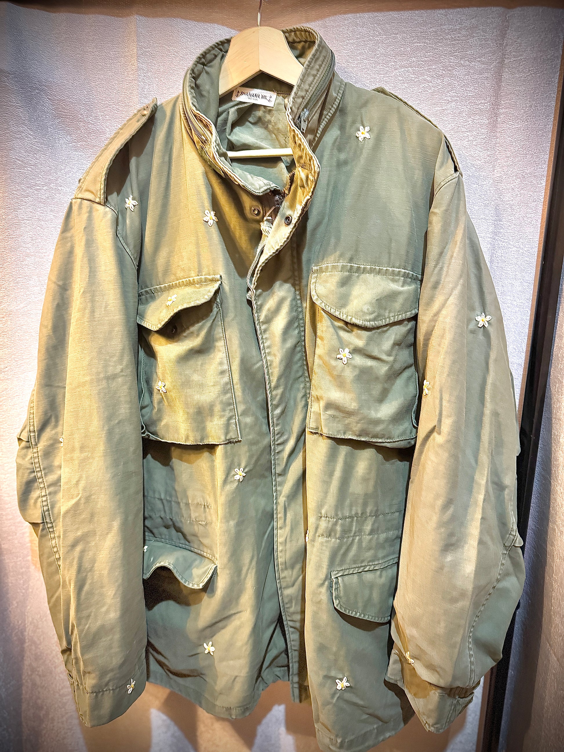 アメリカ軍実物のフィールドジャケットにシャナナミルのデイジー手刺繍を加えた1着。