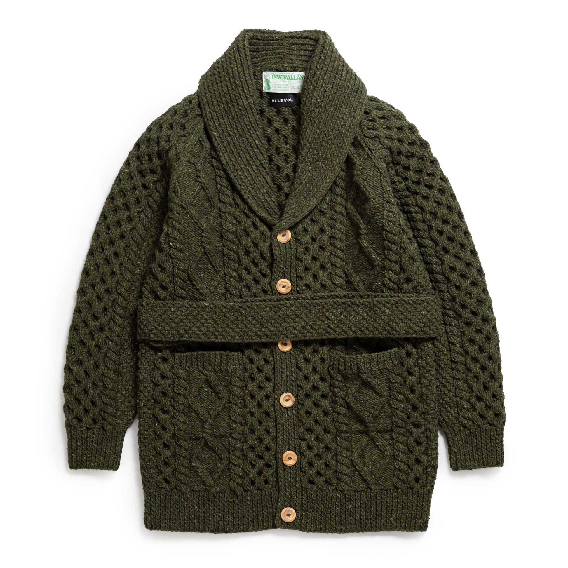 スコットランドのインバーアランとアレヴォルとのコラボレーション。伝統的なケーブル編みパターンで手編みされています。このロングショールカラーカーディガンスタイルは、スコットランドでウールとモヘアのブレンド素材で編み上げられています。ボタンフロントとベルト付きウエストに、2つのパッチポケットを組み合わせ、シンプルな編み込みリブ袖口と裾で仕上げられています。