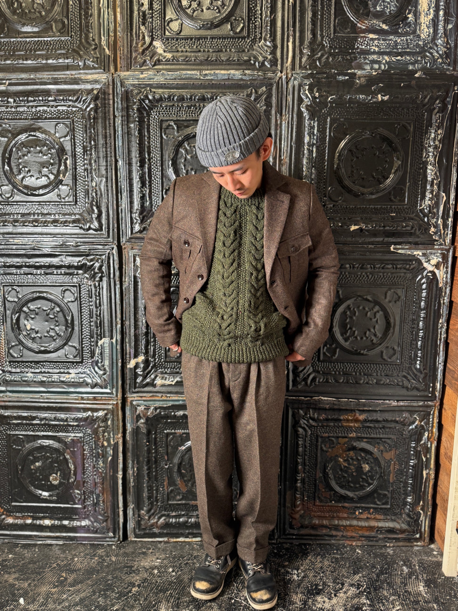 フランスのミリタリーウェアをベースに、冬でも暖かく穿ける生地感と、2タック入りのゆったりしたワイドテーパードシルエットで再構築しました。 素材には、英国 MARTON MILLS製の レッドスタート イングリッシュツイードウールクロス495g/m² を使用しています。