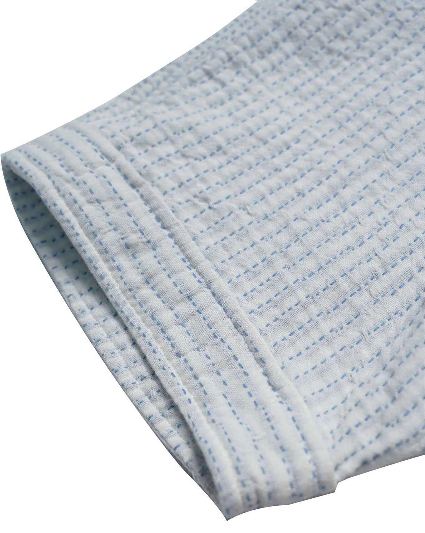 とても柔らかいコットン生地に、刺し子ステッチが施されています。身頃にはホワイト、袖はそれぞれブルーとピンクでトリコロールカラーのステッチです。