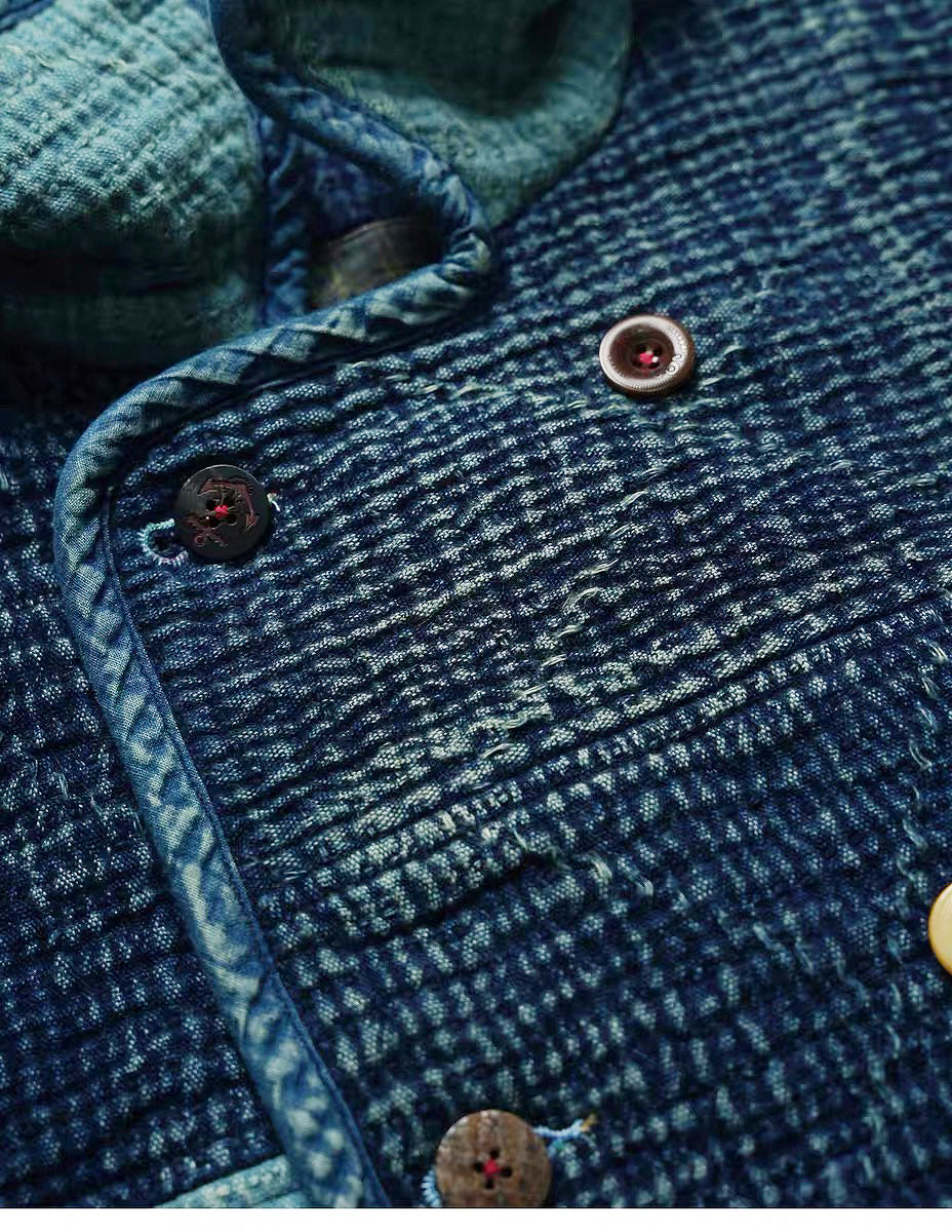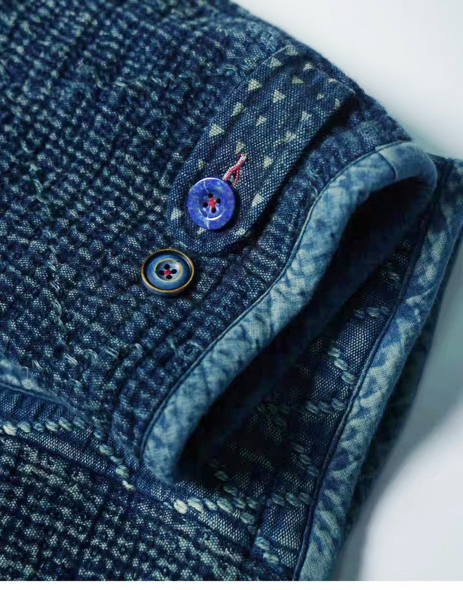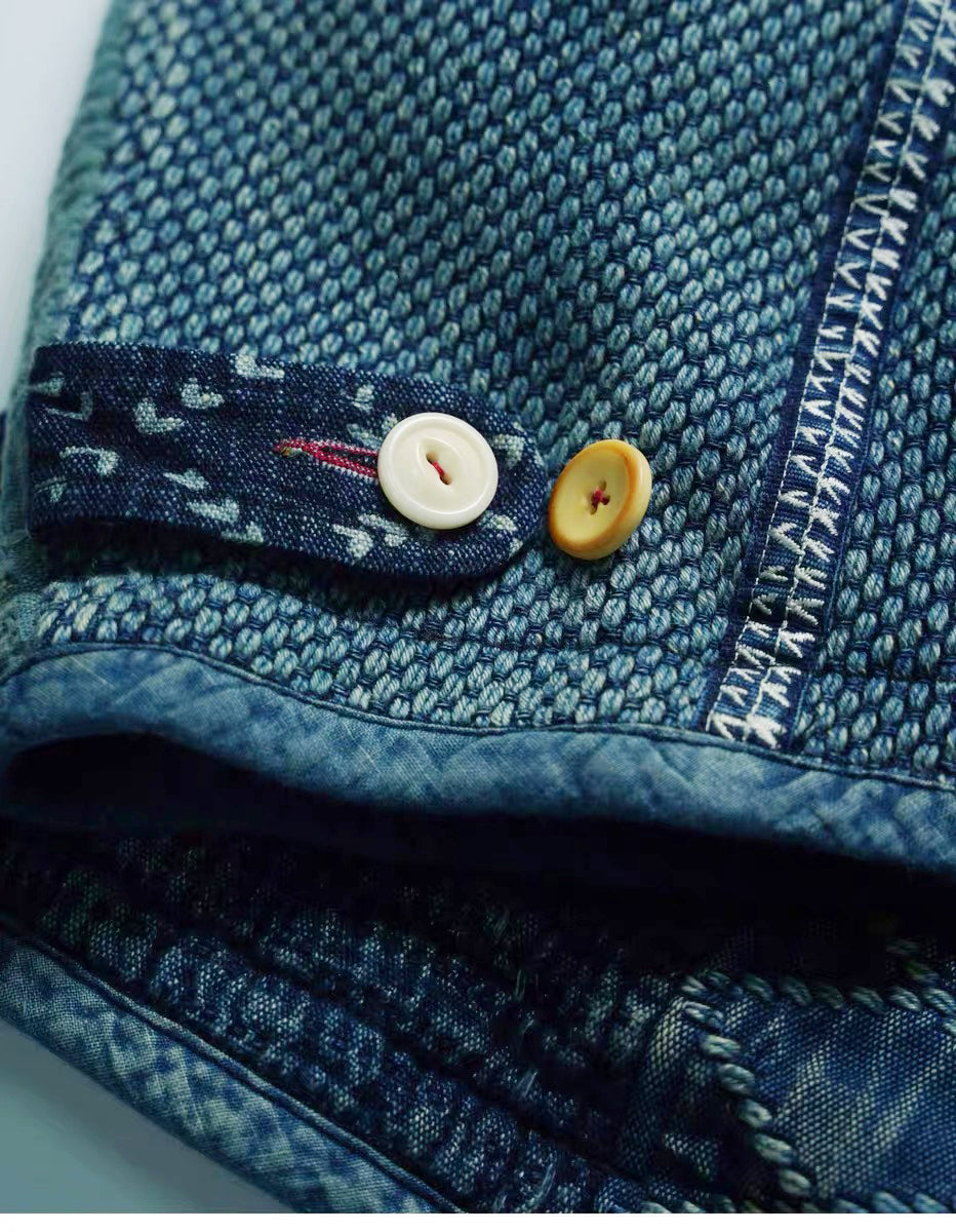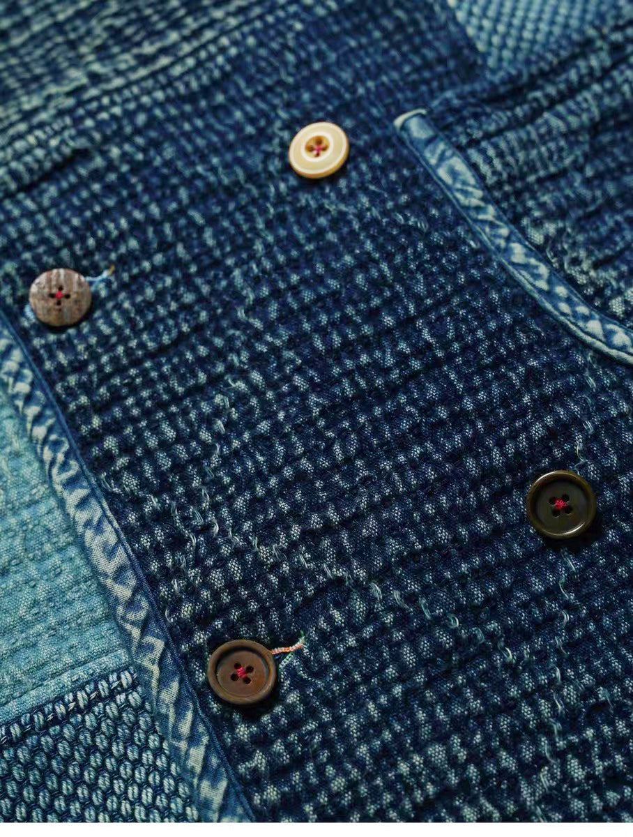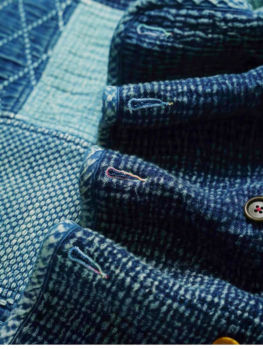 刺し子やジャカードのインディゴ生地をパッチワークした生地をワークスタイルのジャケットに仕上げた、製作に手間のかかった一着。モチーフとしているのはヴィンテージのフレンチワークジャケットです。フロントをダブルブレスティッド仕様にすることで、一層スタイリッシュに仕上げています。男女問わず着こなしていただけるデザイン。ヨーロッパで大人気のBORO STYLEとフレンチワークを融合しました。